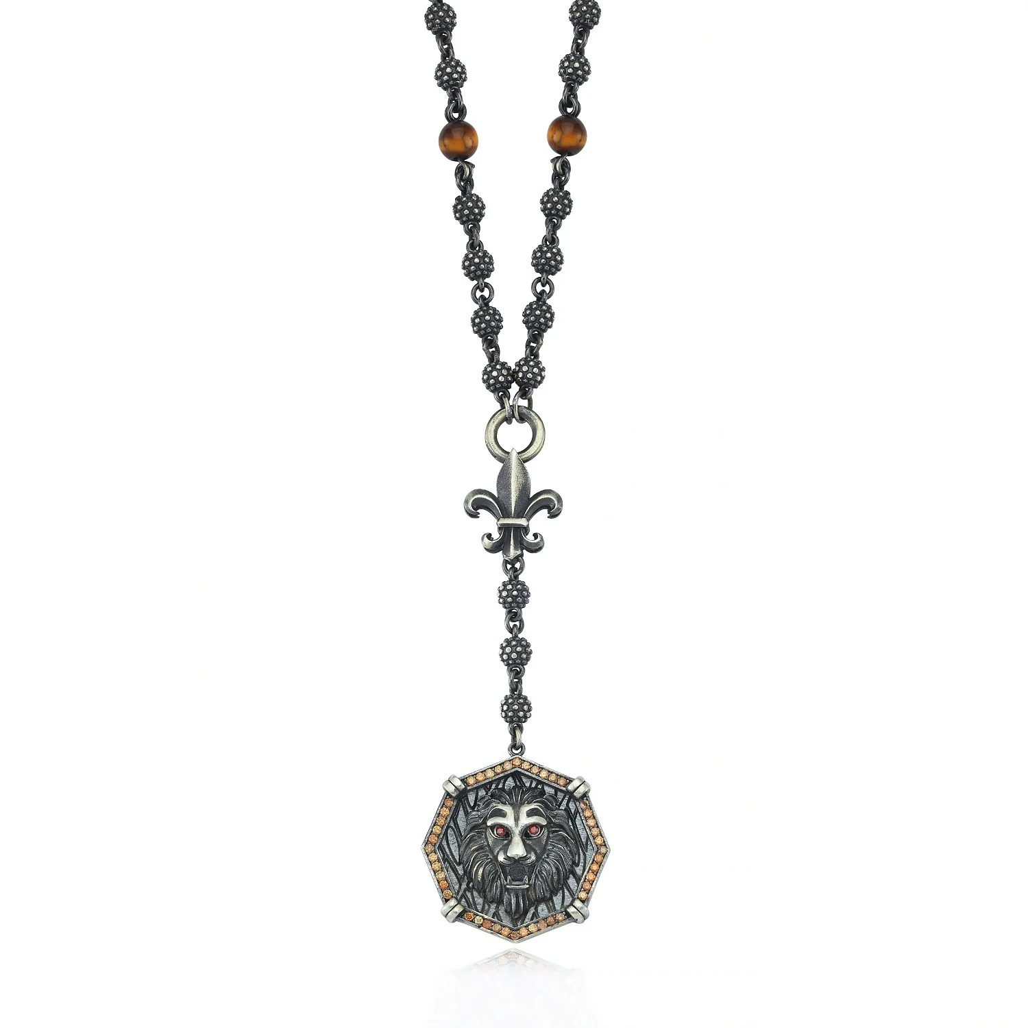 RARE PRINCE by CARAT SUTRA | Unique Silver Balls & Natural Tiger Eye Beaded Chain Necklace with Lion Head | 925 Sterling Silver Oxidized Pendant with Fleur-de-lis Symbol | Men's Jewelry | With Certificate of Authenticity and 925 Hallmark