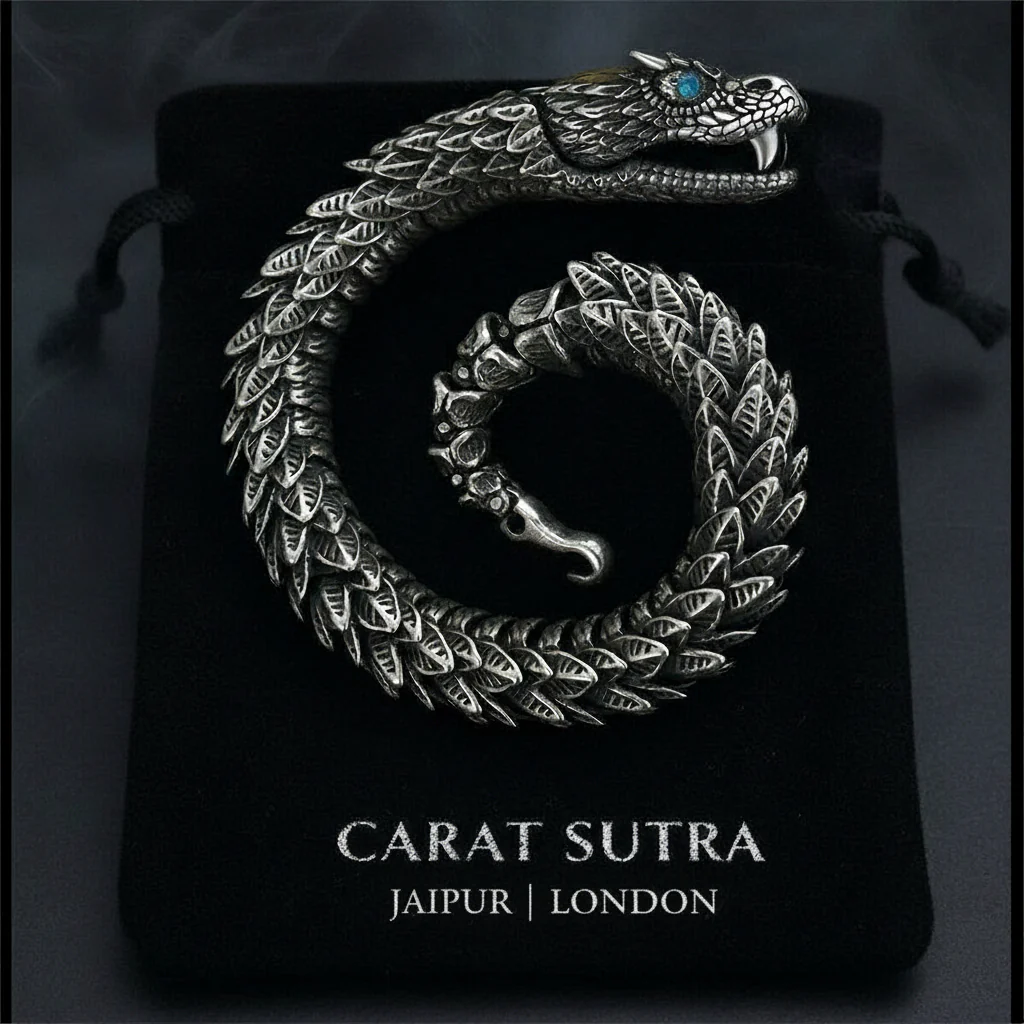 - PRODUCT DETAILS: This is an Exclusive 925 Pure Sterling Silver Oxidized Snake Bracelet with Golden Head and Blue Eyes. For 8 inches length, the weight is expected to have 60 grams gross weight.